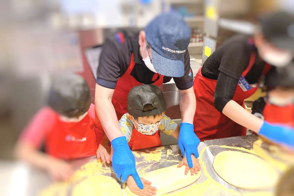特別な場所で行うのではなく実際に営業している店舗の厨房に入って、ピザ作りのプロであるドミノクルーから教えてもらいながらピザを作ります。1人につきMサイズを1枚作成します。こどもはもちろん大人も参加可能で、作ったピザは店内で食べるorお持ち帰りのどちらも選択可能です。