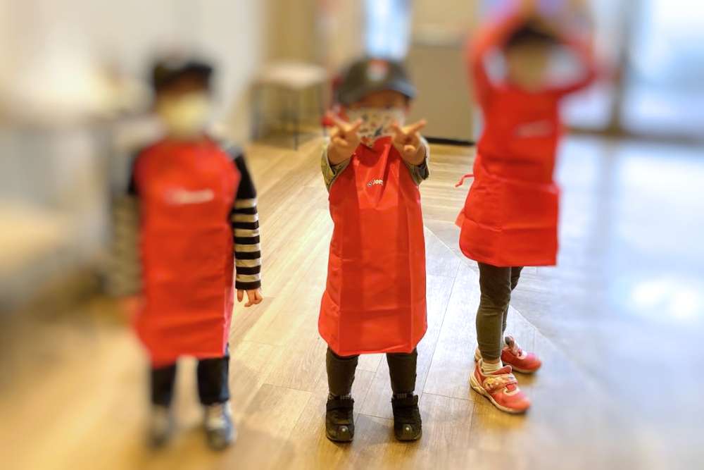 体験をするこども達は早速もらったエプロンとキャップにお着替え。お店のクルーの方と同じリアルな衣装にこどもたちは大喜びです。