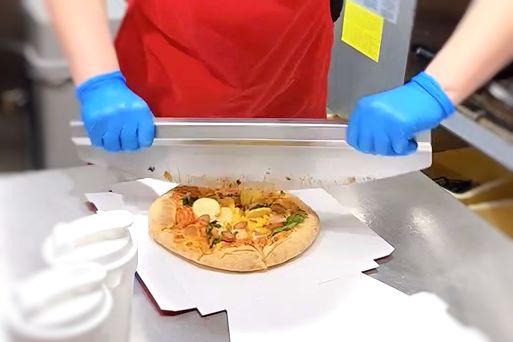 こどもと一緒に組み立てて準備しておいたドミノ・ピザの宅配用ボックスに入れて、店員さんが続いて出してきたのは、大きなピザカッター。手慣れた様子でザクザクっと8等分にカットしてくれました。