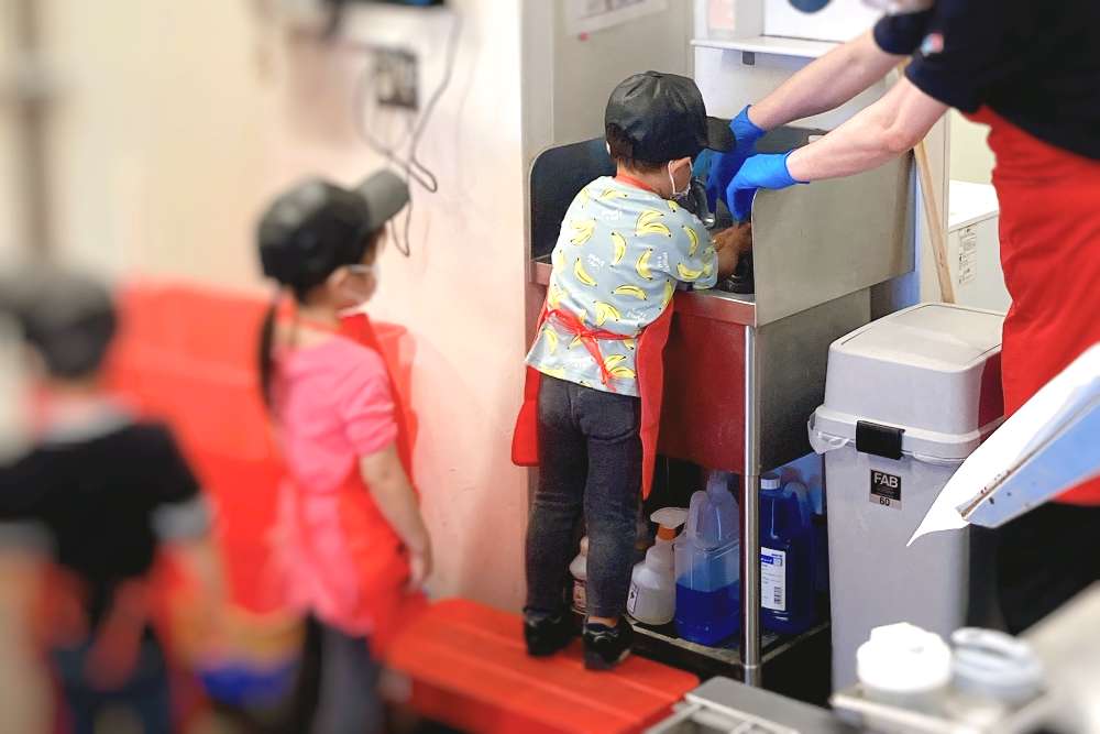 着替えたら厨房に入ります。ピザ作り体験をしない親達は厨房の中には入らずにカウンター越しから見守ります。厨房に入ったらまずは手洗い・消毒です。クルーの方が手伝ってくれながら肘までしっかり洗えました。