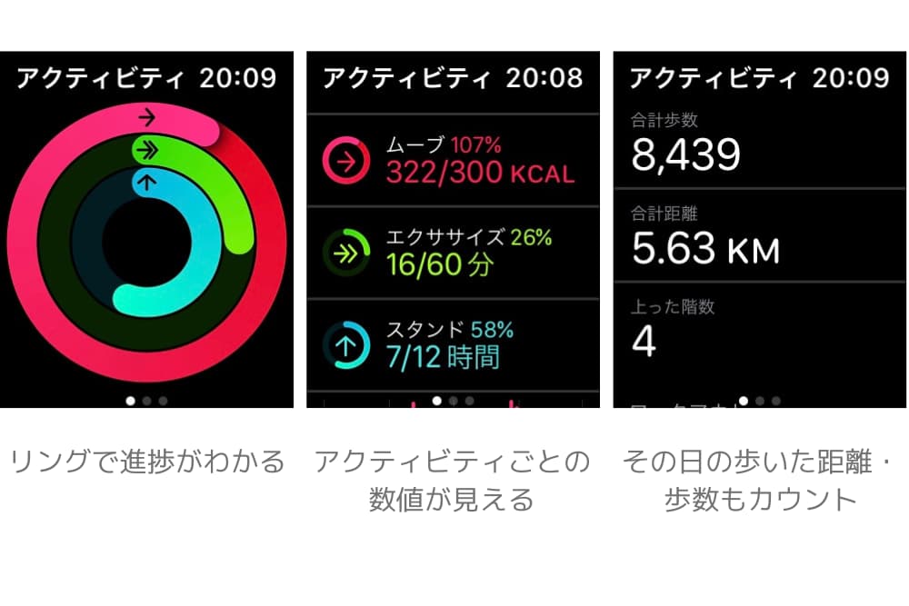 毎日の活動量を常に計測する「アクティビティ」という機能があります。