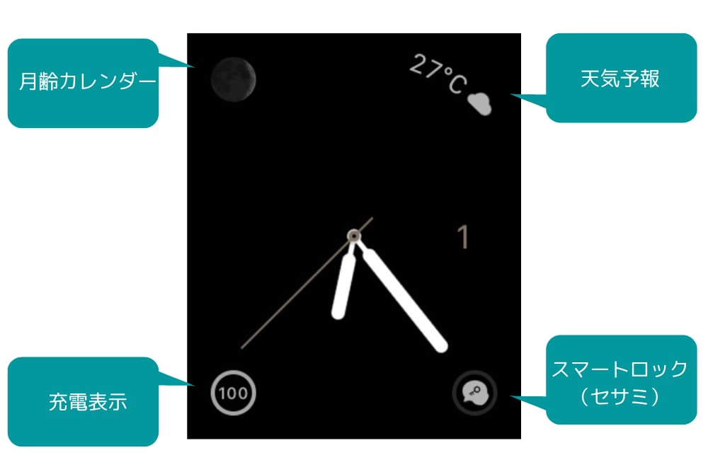 右上から時計回りに、天気予報、スマートロック(家の鍵)、充電表示、月の満ち欠け(月齢)を配置しています。